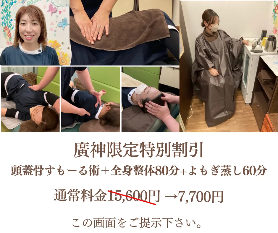 《ネット予約の際は、よもぎ蒸し60分他のコースとセットで2200円と頭蓋骨すもーる術40分+リフレ(足つぼ)40分の2つをお選び下さい》